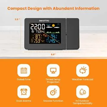Show more Introducing the innovative SmarTro Projection Alarm Clock – a perfect addition to your bedroom for a seamless experience in time and temperature management. This advanced clock not only displays time but also projects it onto your ceiling or wall in a soothing red glow, making it effortless to check the time at a glance without straining your eyes. The adjustable projection angle allows you to customize the view to suit your preferences, ensuring you have the optimal angle for viewing right from your bed.