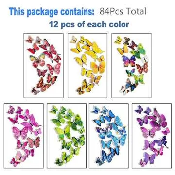 Show more Transform any space into a vibrant sanctuary with these stunning 3D butterflies. This carefully curated set features a total of 84 pieces in a breathtaking array of colors including Blue, Purple, Green, Red, Pink, Yellow, and Multicolor. Each butterfly comes in various sizes, with 4 pieces measuring 6cm, 4 pieces at 8cm, 2 pieces at 10cm, and 2 pieces at 12cm, ensuring a diverse look that will captivate onlookers. Made from lightweight, durable materials, these butterflies are not just decorations but an invitation to let your creativity soar.