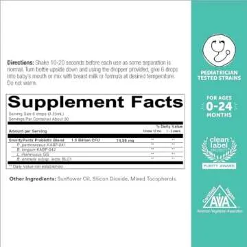 Show more Introducing the SmartyPants Baby Probiotic Drops, a premium, science-backed solution specifically designed to support the digestive and immune health of your little ones. These drops are ideal for both breast- and formula-fed babies, aged from 0 to 24 months. Each serving delivers a powerful blend of pediatrician-tested probiotics to ensure your baby receives the best support during their crucial early years. With 1.6 billion CFU in each serving, these drops offer the optimal balance of probiotic strains that are clinically studied to help soothe fussiness and reduce crying caused by occasional tummy troubles.