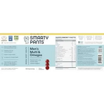 Show more Introducing the SmartyPants Men's Multi & Omegas, the ultimate gummy multivitamin crafted specifically for men! Packed with premium, science-backed nutrients, this delicious supplement is designed to help fill the nutritional gaps in your daily diet. Unlike traditional vitamins, these gummies come in an array of mouthwatering flavors like Lemon Crème, Blueberry, and Blackberry, ensuring you enjoy your daily health boost. Each gummy is formulated with bioavailable forms of high-quality nutrients such as methylated folate, vitamin B12 as methylcobalamin, vitamin D3, and zinc citrate, making it easier for your body to absorb essential vitamins.