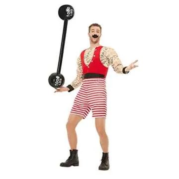 Show moreStep right up and embrace the thrill of the circus with the Smiffys Deluxe Strongman Costume! This eye-catching outfit features a bold red and white short jumpsuit, adorned with classic circus details that will make you the star of any fancy dress event. Complete with a dapper moustache, this costume is designed for men with a chest measurement of 42"-44", a waist of 36"-38", and an inseam length of 33". Perfect for themed parties, this remarkable costume strikes a perfect balance between fun and nostalgia, bringing a touch of the carnival right to your wardrobe.