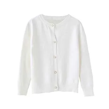 SMILING PINKER Little Girls Crewneck Cardigans Button Knitted Uniform Sweaters Solid Long Sleeves(7-8 Years,White)