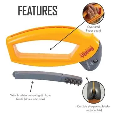 The large handle of this durable sharpener provides a comfortable grip, perfect for users wearing gloves. Its oversized soft-grip ensures that you maintain control during sharpening, while the built-in finger guard enhances safety, allowing you to sharpen your tools securely without worry. Additionally, a practical wire-bristled cleaning brush is cleverly integrated into the handle for easy accessibility and storage, simplifying your maintenance routine.
