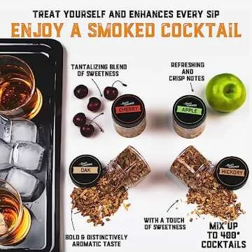 Show more Immerse yourself in the world of exquisite taste with our premium 4 Varieties of Smoking Flavors. This exceptional variety pack includes 2oz containers of Apple, Hickory, Oak, and Cherry wood chips designed for cocktail smokers, providing you with sufficient materials to infuse over 100 cocktails per flavor, totaling an impressive 400+ bold and smoky drinks. Perfect for whiskey, bourbon, and rum enthusiasts, this set allows you to transform ordinary cocktails into delightful smoky masterpieces.