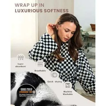 Show more Indulge in the exquisite comfort of our plush fleece bathrobe, designed specifically for women who cherish both style and relaxation. Made from 310 GSM of 100% premium fleece fabric, this robe guarantees exceptional softness and warmth while providing a lightweight feel that's perfect for lounging around the house. The black and white checkered print adds a classic touch to your loungewear collection, allowing you to embrace timeless elegance without sacrificing comfort.