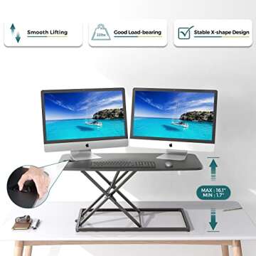 Show more Introducing the ultimate solution for anyone looking to enhance their workspace - the premium Standing Desk Converter. This innovative desk converter allows you to effortlessly transition from sitting to standing, promoting a healthier work environment. Designed with a sophisticated lift and descent mechanism, it delivers a smooth operation that adjusts effortlessly from a minimum height of 1.7 inches to a maximum height of 16.1 inches, making it perfect for users of varying heights, especially those under 75 inches tall.