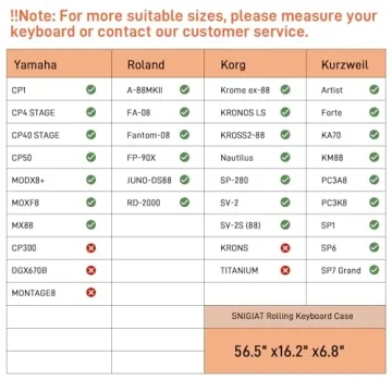 Introducing the SNIGJAT 88 Key Keyboard Case with Wheels, a top-of-the-line solution for musicians on the move! Specifically designed to accommodate most standard 88-key digital pianos and keyboards, this case features an inner size of 56.5" x 16.2" x 6.8"—making it essential for anyone serious about music. This spacious rolling keyboard case is tailored for convenience, boasting three exterior zippered pockets which provide ample storage for music sheets, sustain pedals,...