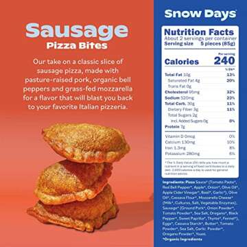 Show moreExperience the joyful fusion of nostalgia and quality with Snow Days Grain Free and Organic Sausage Pizza Bites. These aren’t just any pizza bites – they are a revolution in snack time, merging childhood favorites with modern health-conscious choices. Each bite features a deliciously crispy cassava crust that is both gluten-free and grain-free, ensuring you can indulge without compromising your dietary preferences. Made with only the finest ingredients, including CERTIFIED ORGANIC components, these pizza bites are free from artificial additives, delivering a guilt-free snack that’s both wholesome and satisfying. Perfect for individuals on the go or anyone seeking a quick meal solution!