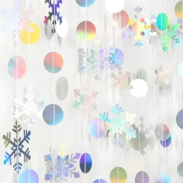 Show moreTransform your special occasions into magical experiences with our Snowflake-Snow Iridescent-Holographic Christmas Party Decoration Garland. This exquisite decoration set features a total length of 52 feet of shimmering beauty, designed to captivate your guests at any event. Each garland, measuring a generous 15 feet, is meticulously crafted from eco-friendly, dual-sided holographic silver paper, ensuring a dazzling display that glimmers under any lighting. Inside the package, you'll find four stunning garlands adorned with a charming arrangement of snowflakes and iridescent dots—36 pieces in total, featuring both 7cm snowflakes and 5cm dots that beautifully complement the winter wonderland theme.