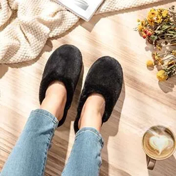 Show moreIndulge in the sublime comfort of the Snug Leaves Women’s Fuzzy Scuff Slippers—your new favorite house shoes designed to transform every at-home experience into a cozy retreat. Made with ultra-soft faux fur, these slippers envelop your feet in plush warmth, making you feel like you’re walking on clouds. Perfect for unwinding after a long day, their delightful design combines both style and relaxation, ensuring you not only feel good but look good as well. The elegant black color seamlessly fits into any home attire, making it a versatile addition to your loungewear collection.