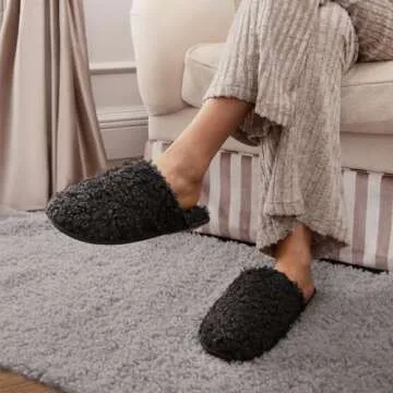Snug Leaves Women's Scuff Slippers Furry Cute Curly Faux Wool Slip-on Indoor Memory Foam House Shoes Dark Black, 7-8 US