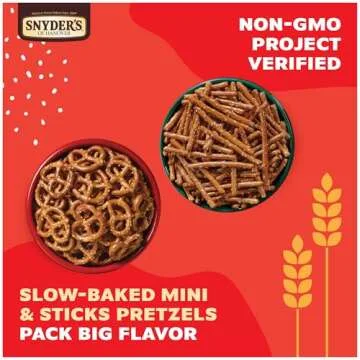 Show moreIndulge in the crunchy delight of Snyder's of Hanover Pretzel Snacks, a perfect family-sized treat featuring both pretzel sticks and mini pretzels! Each snack comes in convenient, 100 calorie individual packs, making portion control a breeze while satisfying your cravings throughout the day. Slow-baked for maximum flavor, these pretzels are crafted to deliver a deliciously crispy bite that will leave you wanting more.