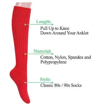 Show moreStep back in time with our sockfun Novelty Slouch Socks, your perfect companion for embracing that quintessential 80s and 90s retro style. Designed specifically for women and girls, these red scrunch socks channel a fashionable nostalgia, enabling you to sport a throwback look effortlessly. Whether you pull them all the way up as cozy boot socks or scrunch them down for a more casual vibe, these socks are designed to enhance your outfit and your comfort. Made from a lush blend of 90% cotton, 8% nylon, 1% spandex, and 1% polypropylene, they offer unbeatable softness and breathability for all-day wear.