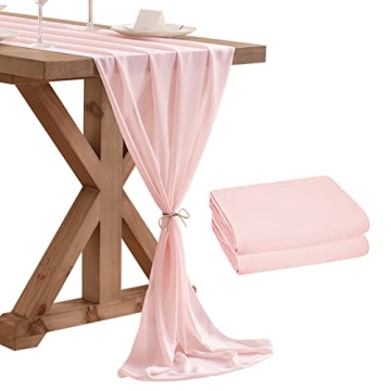 Show more Transform your event tables with the exquisite Socomi Blush Pink Chiffon Table Runner. Measuring at an impressive 29 inches wide by 120 inches long, this table runner is the epitome of elegance and versatility. Crafted from 100% polyester chiffon, it offers a soft, luxurious feel while ensuring that it stays securely in place. The delicate draping effect it provides adds a touch of romance that’s perfect for a myriad of occasions from weddings to baby showers.