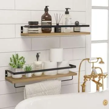 SODUKU Floating Shelves for Wall, Bathroom Shelves with Towel Bar, Wall Mounted Storage Shelves for Kitchen, Bathroom, Set of 2 Natural