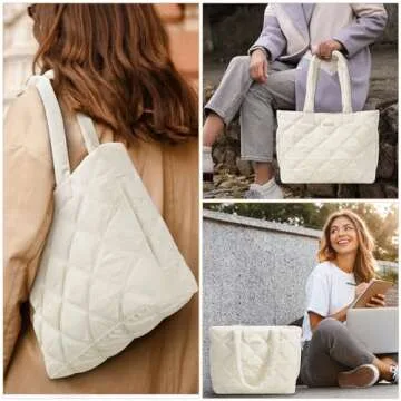 soewten Tote Bag for Women, Quilted Women Tote Bag with Zipper, Lightweight Puffer Work Bag Multiple Pockets, Shoulder Bag Handbags Top Handle Large Purse for Casual Work, Gift for Women Beige