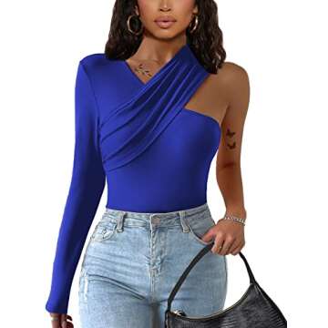 Show moreIntroducing the SOFIA'S CHOICE Women's Long Sleeve One Shoulder Top with Pads Criss Cross Shirt, an exquisite addition to any fashion-forward woman's wardrobe. Crafted from a soft, comfy polyester that is lightweight yet durable, this unique top features an eye-catching asymmetrical design with one sleeve and one shoulder. The padded shoulder detail adds a contemporary twist, elevating your style while providing the perfect structure to frame your figure beautifully. Available in a stunning blue hue, this shirt is versatile enough for casual outings or dressier occasions, ensuring you always stand out.