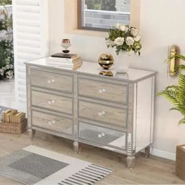 SOFTSEA Modern 6 Drawer Mirrored Dresser, Glass Dresser & Chest of Drawers, Silver Finished Storage Cabinet with Crystal Knobs, Easy Assembly