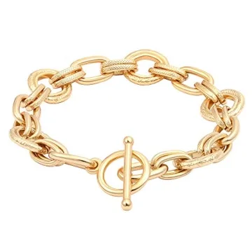 Show moreIntroducing the exquisite Textured Oval Link Bracelet in Gold, a stunning piece that embodies both elegance and contemporary style. This beautiful bracelet showcases a unique design with its special links, crafted with high-quality 18K gold plating and a duplex finish that ensures a luxurious appearance. The chunky design provides an excellent tactile experience and a brilliant shine that stands out, making it significantly more fashionable than typical accessories. With its unique curb chain construction connected through a convenient OT buckle, this bracelet ensures easy wear while infusing simplicity into its fashionable appeal. Measuring at a comfortable length of 7.87 inches (20 cm) and a width of 0.47 inches (1 cm), this oval link toggle bracelet strikes the perfect balance between boldness and sophistication.