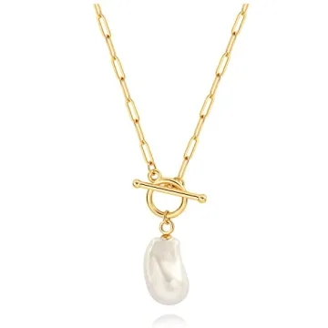 Show more Introducing the SOFYBJA 18K Gold Plated Paperclip Link Chain Necklace, an exquisite piece of jewelry that embodies elegance and style. This eye-catching necklace features a beautifully crafted baroque pearl pendant, suspended gracefully on a trendy paperclip chain. The unique charm of the irregular baroque pearl adds an unexpected twist to a classic design, ensuring that you stand out from the crowd. With its 20-inch length and OT toggle clasp, this necklace offers both comfort and ease of wear, making it a perfect accessory for any occasion. Whether you’re dressing up for a special event or simply accentuating your everyday outfits, this necklace is destined to become your new favorite go-to accessory.