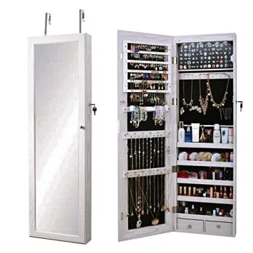 Show more Introducing the soges Jewelry Armoire with Mirror, a modern solution for all your jewelry organization needs. This elegant piece is designed not only to be functional but also to elevate the aesthetic of your room. With a stunning full-length mirror, you can view your outfit from head to toe, ensuring you always look your best before stepping out. The standout feature of this jewelry armoire is its auto LED lights, which provide soft, warm illumination – perfect for checking your makeup or selecting the ideal accessory. Its versatile design allows you to mount it on your wall or hang it over a door; you can easily adapt it to fit your space, making it a practical addition to any home.