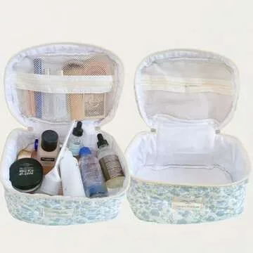 SoGhhd Floral Quilted Makeup Bag Set for Women Aesthetic Travel Large Cute Cosmetic Toiletry Pouch Lightweight Cotton Tote Purse Organizer Insert Valentines_Gifts for Her, c01 (3PCS#01Blue Flower)