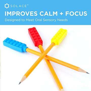Show more Introducing the SOLACE Chewelry Chewable Pencil Toppers – a revolutionary solution designed to enhance focus and promote calmness in children with sensory needs. Expertly crafted for kids with autism, ADHD, SPD, and those requiring oral stimulation, these chewable pencil toppers are your go-to tool for sensory support. Each pack contains six colorful, durable toppers that not only add fun to writing but also provide valuable sensory input. Made from 100% pure silicone, they are free from harmful substances like lead, latex, BPA, PVC, and phthalates, ensuring a safe experience for every child.
