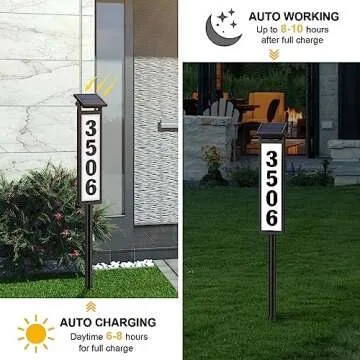 Show more This exquisite solar-powered address sign by Eyrosa is more than just a practical addition to your outdoor decor; it’s a statement piece that combines functionality with stunning aesthetics. Crafted from premium materials, including a durable aluminum frame and a high-quality stainless-steel tube, this address sign is built to withstand the test of time and the elements. Its sleek white plaque features bold black numbers that not only stand out during the day but are also brilliantly illuminated at night, ensuring that your home is always easily recognizable. No more worrying about guests missing your house or delivery mishaps!