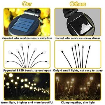 Adorn paths, flowerbeds, or patios with these delightful solar firefly lights and bask in the glow of their enchanting presence. Perfect for any outdoor occasion—be it a wedding, a garden party, or just your nightly relaxation—these lights cater to all your decorative needs. With a design that allows them to avoid clumping and provides flexibility in arrangement, you can create magical scenes customized to your liking.