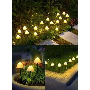 Show more Transform your outdoor space into a whimsical wonderland with our efficient solar mushroom string lights! These delightful string lights feature a sophisticated monocrystalline silicon solar panel that is adjustable up to 180 degrees, ensuring optimal sunlight capture throughout the day. Equipped with a powerful 800mAh rechargeable battery, the lights can automatically illuminate your garden for an impressive 8 to 10 hours once fully charged, all without any added electric costs.