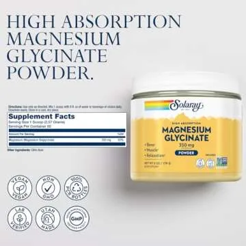 Show more Unlock the potential of optimal health with **SOLARAY Magnesium Glycinate Powder**. This premium supplement delivers a remarkable **350 mg** per scoop, which accounts for a generous **83% of your daily value** of magnesium! Known for its exceptional absorption, Magnesium Glycinate (or Magnesium Bisglycinate) offers the perfect blend of bioavailability and potency, making it one of our best-selling mineral supplements. Designed for those seeking to enhance their wellness journey, this unflavored powder easily mixes into water or your favorite beverage, providing a convenient way to bolster your supplement routine. Experience the benefits of powerful muscle support, healthy bones, and enhanced relaxation—all in one scoop!