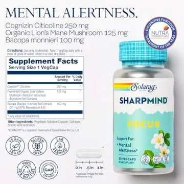 Show moreUnleash your cognitive potential with SOLARAY SharpMind Focus, a premium nootropic supplement crafted to elevate mental alertness and enhance memory function. This powerful formulation uniquely bypasses the common route of caffeine dependency to provide true, sustainable brain health support. Enriched with Cognizin Citicoline (250 mg) and Bacopa Monnieri (100 mg), it stands out in its category, offering a blend that not only boosts focus but also nurtures your neurological pathways for improved memory retention.