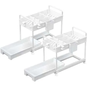 SOLEJAZZ 2-Tier Under Sink Organizer, Sliding Bathroom Drawer with Hooks and Dividers