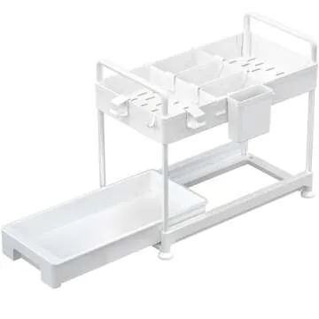 SOLEJAZZ 2-Tier Under Sink Organizer, Under Bathroom Sink Cabinet Sliding Under Sink Storage Organization, Multi-purpose Kitchen Shelf with Hooks, Hanging Cup, White