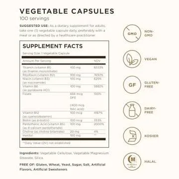 Show more Discover the transformative power of Solgar B-Complex 100 Vegetable Capsules, a premium supplement designed to provide the essential B Complex vitamins your body craves for optimal energy metabolism. These capsules are meticulously crafted to aid in converting carbohydrates, fats, and proteins into energy, ensuring you feel revitalized throughout the day. Each vegetarian-friendly capsule is a testament to Solgar's commitment to quality and nutrition, making it the perfect choice for those adhering to vegan or vegetarian diets.