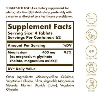 Show more Introducing the Solgar Chelated Magnesium – a powerhouse supplement designed to support your overall well-being and maintain optimal health. With 250 tablets packed into each bottle, this vegan, non-GMO formulation is specifically tailored to enhance nerve and muscle function, promote healthy bones, and ensure vital cellular energy release. Made with a patented form of chelated magnesium, it guarantees optimal absorption to maximize its numerous benefits. Solgar’s commitment to quality ensures you’re receiving a product that meets the highest standards, as it has for over 70 years.