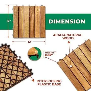 Show more Transform your living spaces with our Solid Wood Interlocking Flooring Tiles. Perfectly designed for both indoor and outdoor use, these tiles bring a touch of elegance and natural beauty to any setting. Crafted from exquisite Acacia wood, known for its incredible durability and weather resistance, these tiles allow you to create stunning decks, patios, balconies, and more. Their interlocking system makes installation a breeze; simply snap them together on any solid surface like concrete, wood, or pavers. The 12" x 12" size is perfect for quick coverage and versatility, while their waterproof properties ensure lasting beauty in any weather conditions.