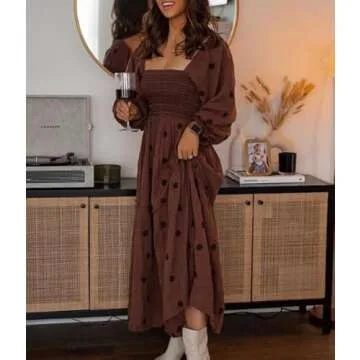 Show moreStep into a world of elegance and charm with the SOLILOQUY Boho Embroidered Floral Dress. Crafted from a luxurious blend of polyester and spandex, this stunning maxi dress offers unparalleled comfort and a lightweight feel, making it your perfect companion for both sunny beach days and stylish evenings out. The fitted bodice has been thoughtfully designed for larger busts, featuring long puff sleeves that add a touch of drama to the overall relaxed silhouette. With its square neck design and chic smocked waistline, this dress emphasizes your waist beautifully, creating a flattering shape that exudes confidence and grace.