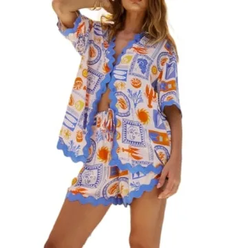 Show moreIntroducing the SOLILOQUY Women 2 Piece Boho Outfits Short Sleeve Button Down Shirt + Pajama Shorts Set, an exquisite addition to your summer wardrobe. Perfectly crafted from soft and breathable polyester, this y2k-inspired lounge set guarantees a delightful wearing experience that is both comfortable and stylish. The ensemble features a charming lapel neck button-down shirt with short sleeves, adorned with an elegant ric rac trim, paired effortlessly with vibrant printed shorts. Designed with a loose fit, this set complements every physique, ensuring you look effortlessly chic whether lounging at home or out on a sunny beach.