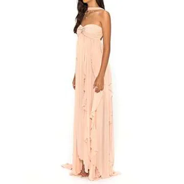 Emphasizing beauty and style, the dress features a beautifully ruched bust, ruffle pleated hemline, and layers of delicate sheer mesh that adds an air of softness and romance to your look. The strapless A-line maxi design enhances your natural curves, making it an impeccable choice for any occasion. Whether it’s a dreamy beach vacation or a charming wedding, this dress ensures you shine beautifully.