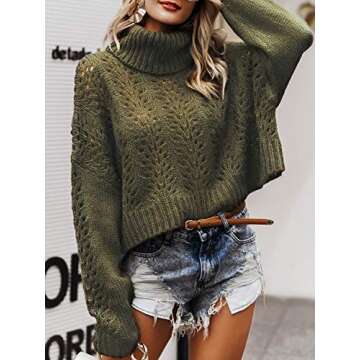 Sollinarry Women's Turtleneck Drop Long Sleeve Loose Hollow Out Knit Pullover Sweater Green 4/6
