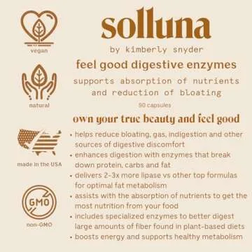 Solluna by Kimberly Snyder Feel Good Digestive Enzymes Digestion & Nutrient Absorption Aid for Stomach Pain, Gas & Bloating — Multi-Enzymes Lipase, Amylase, Protease, Cellulase, & Galactosidase
