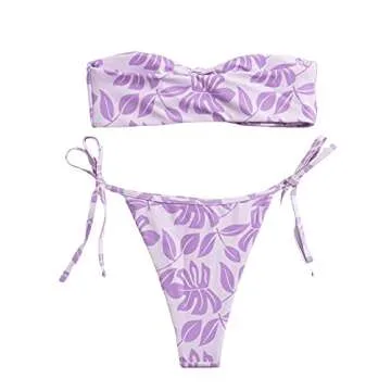 SOLY HUX Women's Bandeau Tie Side Bikini Bathing Suits Leaf Print 2 Piece Swimsuits Lilac Purple L