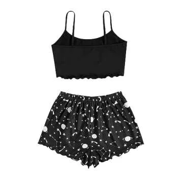 SOLY HUX Women's Cartoon Print Lettuce Trim Cami Top and Shorts Cute Pajama Set Sleepwear Black Star Moon M