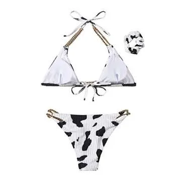 Show moreIntroducing the SOLY HUX Women's Cow Print Halter Triangle Top Bikini Set – a standout addition to your summer wardrobe that effortlessly blends comfort, style, and functionality. This eye-catching bathing suit features a chic cow print design in classic shades of white and black, making it a perfect statement piece for beach outings or poolside lounging. The halter neck design ensures an adjustable fit, catering to various body shapes and sizes while providing excellent support. Made from high-quality materials, this bikini set ensures durability while maintaining comfort, allowing you to enjoy your favorite water activities without a hitch.