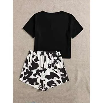 SOLY HUX Women's Cute Cartoon Print Sleepwear Short Sleeve Tee with Shorts Pajama Set Black Cow Letter M