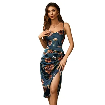 Show moreStep out in confidence and style with the SOLY HUX Women's Floral Print Ruched Split Hem Satin Cami Dress. Crafted from a soft and luxurious satin fabric, this exquisite midi dress features a stunning floral print that brings any woman’s wardrobe to life. It's carefully designed without stretch, ensuring a flattering silhouette, and boasts a fashionable split hem that adds an air of sophistication to its charming appearance. The spaghetti straps and sleeveless design make it perfect for a variety of occasions, allowing you to transition seamlessly from casual events to special parties.