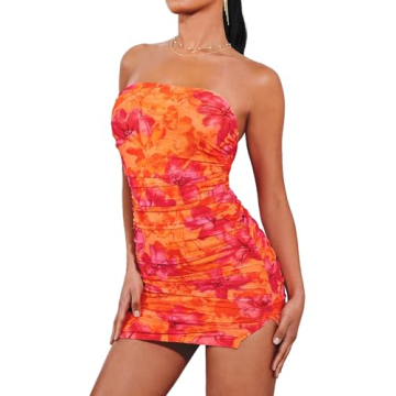 SOLY HUX Women's Floral Tube Dress Summer Strapless Bodycon Mini Dress Party Clubwear Orange Floral Medium