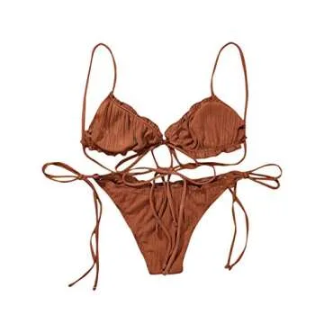 SOLY HUX Women's Frill Trim Triangle Top and Tie Side Bikini Set Two Piece Swimsuits Pure Brown S