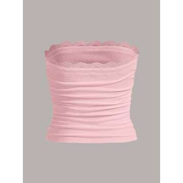 SOLY HUX Women's Lace Trim Ruched Bandeau Crop Tube Tops Bowknot Front Strapless Summer Tops Pure Light Pink S
